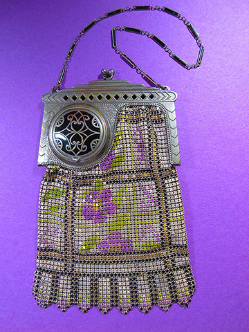 Near-mint, never used Whiting and Davis Mesh compact costume bag featuring Armor mesh, silk lining, enamel frame and chain and enamel decoration of purple flowers and green foliage on a black and gold trellis.