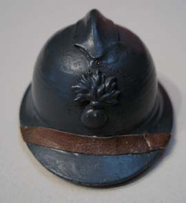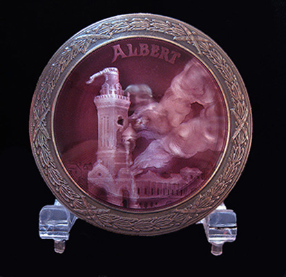 Fine French compact depicting in a mauve cameo-like design under glass the bombing of Albert Cathedral in Albert, France by the British forces in the spring of 1918, during World War I. Albert was the center for the Allies behind the lines but near the Somme battlefields after the British took over the area in 1915. The cathedral was in the center of town, a landmark that, due to its tower and crowning statue, could be seen for miles around and thus provided a target for the enemy. The statue was toppled early in the war but hung precipitously and was stabilized in that position by the French in 1915. When the Germans advanced in the Spring of 1918 it was the British that targeted the cathedral, realizing that the tower could be used as an observation point by the enemy if the German offensive was successful. The Germans were successful, but the town was retaken by the British four months later. Later, the cathedral and statue were fully rebuilt in their original form and still stand today. The compact has the French boar's head mark for 800 silver and the makers mark CB over olive branches, possibly for Charles Brunner.