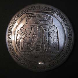 Silver (Arabic script marks) large pancake with symbols and scenes front and back of ancient Persepolis (now in Iran), the ancient Persian capital...