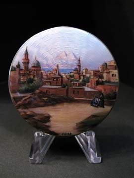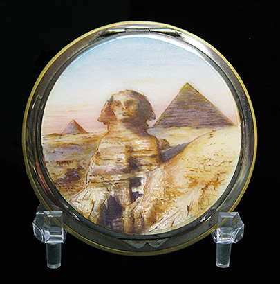 Sterling (marked "925" with British marks) with guilloché and painted scene of the pyramids at Giza from the Mohammed Ali Mosque in Cairo...