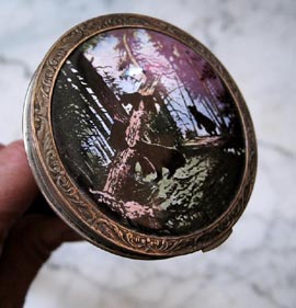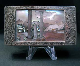 Sterling vanity, marked "Made in Austria" with a view towards St. Peters from the Roman Forum done in intarsia with various colors of mother-of-pearl...