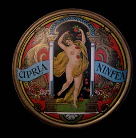 Cardboard powder box with ornate decoration depicting the goddess Psyche inspired by Pompeiian wall painting...