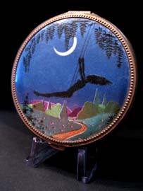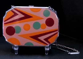 Powder compact with Femme on a swing motif in Deco colors, leather base...