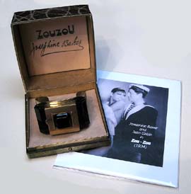 Brass and bakelite "Zou Zou" bracelet compact by Flamande signed Josephine Baker on original box. In 1924 Ms. Baker starred in "Zou Zou" with Jean Gabin. Flamande was a company known for bracelet compacts inspired (or possibly designed) by various artists of the day.