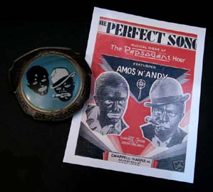 Brass "whoopee" vanity with image of Amos and Andy as seen on the sheet music for "The Perfect Song" the theme song of their famous radio show (1928-1953).
