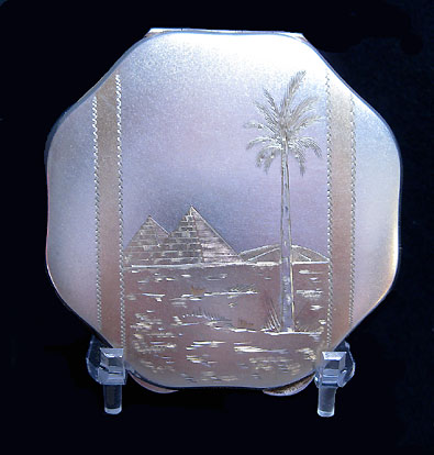 Excellent silver compact marked 935, with a mark indicating import into London. It is probably Austrian. It has a beautiful yellow guilloche back and iridescence in the scene of the sphinx and pyramids on the front.