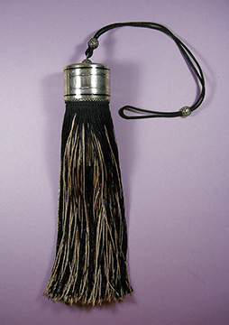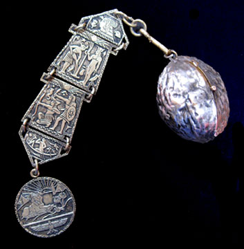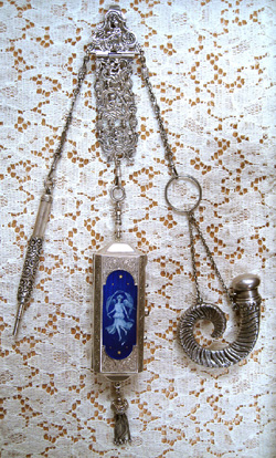 The same on an 18th century sterling French chatelaine with a sterling pencil and a sterling vinaigrette/perfume/snuff container in the shape of a ram's horn
