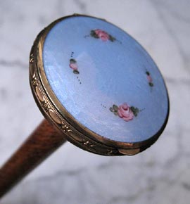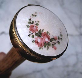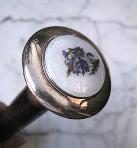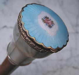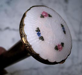 Silvertone powder compact in green guilloché with hand painted roses as the base of an umbrella handle. The compact unscrews and reveals a perfume bottle within the handle...