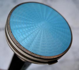 R - Sterling turquoise guilloché and white enamel powder and rouge vanity with an ivory or bone base on an ebony handle...
