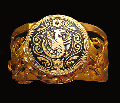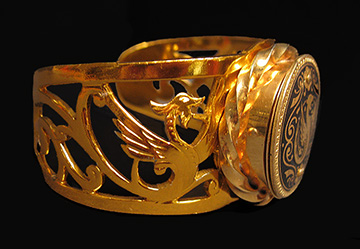 Damascened-inlay style cuff bracelet-compact by Albert Flamand in "Fladium", his own yellow gold version of anodized aluminum. Marked with the"FLAMAND Fladium" trademark, "Made in France Paris" and the signature of Paquita León (see below), it features winged dragons on the compact lid and on the openwork cuff.