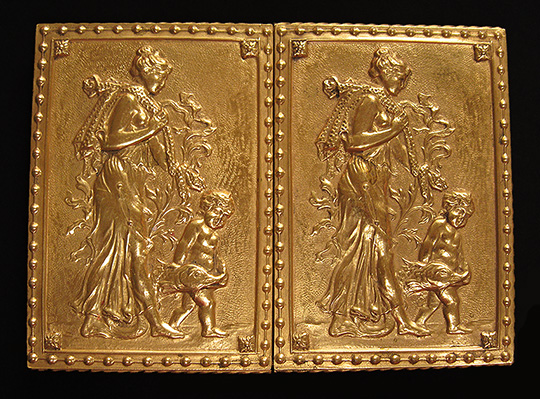 Stunning Italian gold-plated double compact depicting the myth of Leukothea (left with a panther skin over her shoulder) and Palaemon (right accompanied by a dolphin). Palaemon was a young sea god who, with his mother, Leukothea, came to the aid of sailors in distress. He was originally a mortal child named Melikertes whose parents, Ino, daughter of Phoenician Cadmus and Athamas, lord of Boeotia, incurred the wrath of Hera when they fostered the young god, Dionysos. Ino fled with Melikertes in her arms, after Athamas, driven mad by Hera, had killed their other child, and fleeing leapt off the Molurian rocks on the coast of Megara into the sea. Saved by dolphins, the mother and child were transformed into sea-gods and received the names Palaemon and Leukothea. The apotheosis was effected by the Nereides, who saved Melikertes, and also ordered the institution of the Nemean games. The body of Melikertes, according to the common tradition, was washed by the waves, or carried by dolphins into port Schoenus on the Corinthian isthmus, or to that spot on the coast where in later times the altar of Palaemon stood. There the body was found by his uncle Sisyphus, who ordered it to be carried to Corinth, and on the command of the Nereides instituted the Isthmian games. On the isthmus of Corinth there was a temple of Palaemon with statues of Palaemon, Leucothea, and Poseidon; and near the same place was a subterraneous sanctuary, which was believed to contain the remains of Palaemon. In works of art Palaemon is represented as a boy carried by or associated with marine deities or dolphins. Leukothea is often shown with attributes of Dionysos, the child she nurtured, like grapes or, as in this case, panther skins or wild animals.