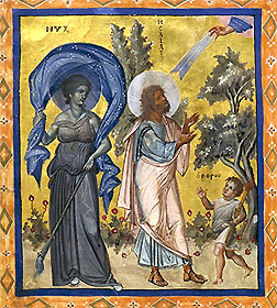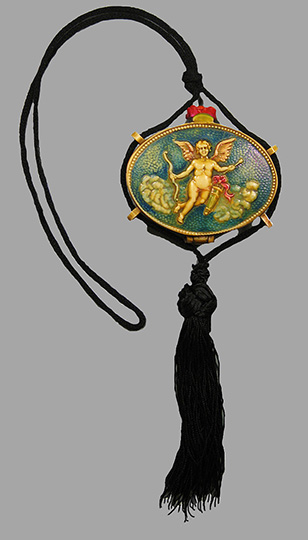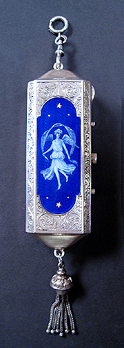 Continental sterling vanity and aide-memoire depicting Nyx, Goddess of Night in painting on guilloché surrounded by stars in gold. She is always shown with a drape as in this example from the Paris Psaulter (10th c) and often also with wings.