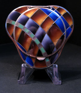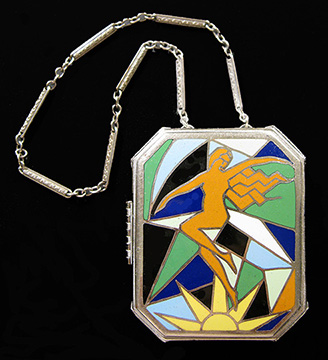 Silvertone tango vanity with Deco enamel motif marked "E.A.M. Elginite"...