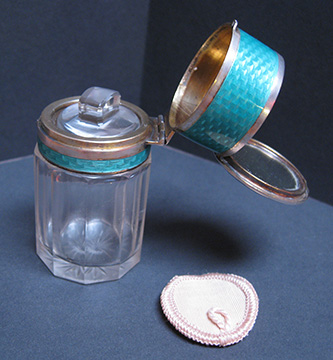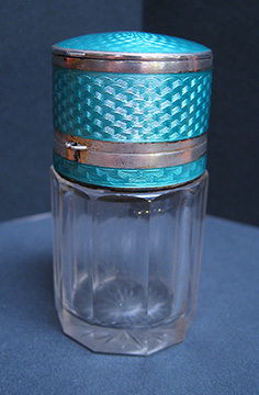 Rare combination compact and scent/smelling salts/pill bottle in sterling with turquoise guilloche, marked as an import to London, 1932. This was probably made in Austria.