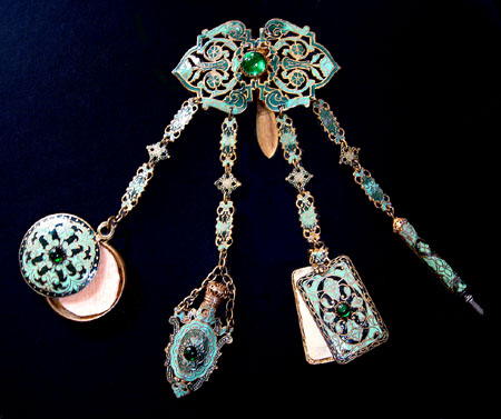 Pristine green jeweled and enameled dance chatelaine with compact, perfume, aide-memoire and pen