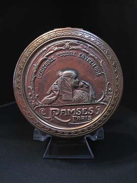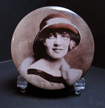 Screw-top compact marked "Parisian Novelty Company Chicago" with a photo of movie star Constance Talmadge. Talmadge was born on April 19, 1898 in Brooklyn, New York into a poor family. Her father, Fred, was an alcoholic and left them when she was still very young. Her mother, Peg promoted Norma as a model for title slides in flickers , which were shown in early nickelodeons. This led Connie, as well as her two sisters, Norma and Natalie, into an acting career. She began making films in 1914, in a Vitagraph comedy short, In Bridal Attire (1914). Her first major role was as The Mountain Girl and Marguerite de Valois in D.W. Griffith's Intolerance (1916). Her friend Anita Loos, who wrote many screenplays for her, appreciated her "humour and her irresponsible way of life". Over the course of her career, Talmadge appeared in more than 80 films, often in comedies like A Pair of Silk Stockings (1918), Happiness à la Mode (1919), Romance and Arabella (1919), Wedding Bells (1921) and The Primitive Lover (1922). She is quoted, "I enjoy making people laugh. Secondly, because this type of work comes easiest and most naturally to me, I am not a highly emotional type. My sister could cry real tears over two sofa cushions stuffed into a long dress and white lace cap, to look like a dead baby, and she would do it so convincingly that 900 persons out front would weep with her. That is real art, but my kind of talent would lead me to bounce that padded baby up and down on my knee with absurd grimaces that would make the same 900 roar with laughter."With the advent of talkies in 1929, Talmadge left Hollywood. Her sister Norma did make a handful of appearances in talking films, but for the most part the three sisters retired all together, investing in real estate and other business ventures. Only a few of her films survive today. Like her sister Norma, Talmadge succumbed to substance abuse and alcoholism later in life. She also had many failed affairs and relationships.Along with her sister Norma, Mary Pickfordb and Douglas Fairbanks, Talmadge inaugurated the tradition of placing her footprints in cement outside Grauman's Chinese Theatre in Hollywood. She left a trail of five footprints in her slab.Her star on the Hollywood Walk of Fame is at 6300 Hollywood Blvd.