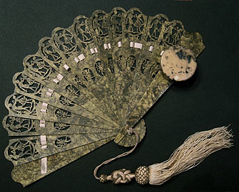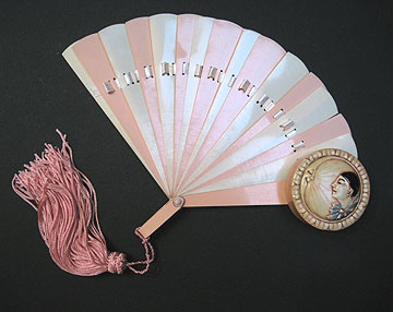 Unusual celluloid fan with cut-out decoration of dancers and cupids and attached compact