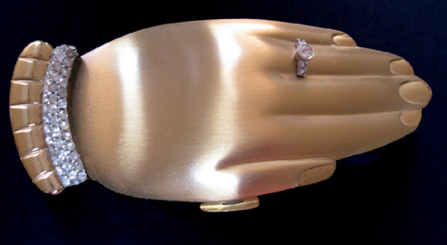 In 1930's, Parisian Albert Flamand invented an original and ornamental design for a cuff bracelet. His company, called by his last name FLAMAND, also invented a plating process called "Fladium" with their trademark “FLAMAND Fladium Deposé”. This high quality anodized aluminum was used by the Flamand Company in their jewelry plated with various materials in several colors. Flamand became notable for a series of bracelet-compacts, often with Bakelite accents, inspired and sometimes signed by well-known celebrities of the day, such as French opera star Claudine Cereola (also in this collection, see Compact Catalogue) or this one signed by Paquita León, a Spanish dancer known in Paris as the “Andalusian Flame”. Flamand made several Bakelite bracelets as promotions for films, including one model for the international American-French entertainer-singer-actress Josephine Baker for her great movie, ZOUZOU (also in this collection, see below).