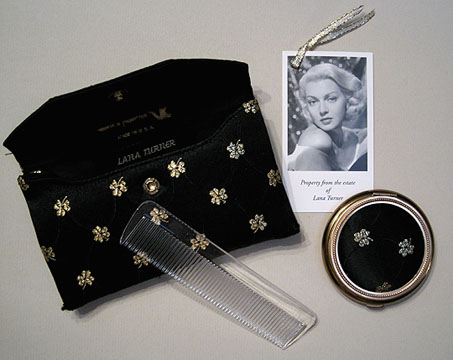Evening set in black satin with gold embroidery by Lin Bren with compact and comb and name plate reading "Lana Turner". Documented from the estate of Lana Turner.