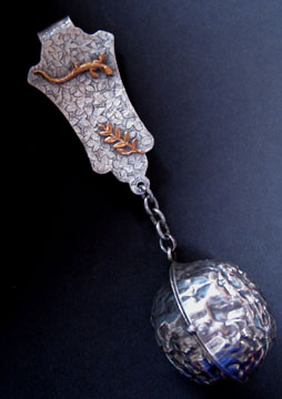 Sterling walnut compact on an interesting woodland theme chatelaine. The chatelaine is marked D&H (Dominick and Haff) 1879 Sterling and the compact is marked 925 Sterling.