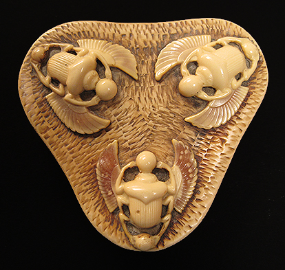 Interesting celluloid compact box with Egyptian scarab figures on lid. Inside are a lipstick, mirror and a powder well.