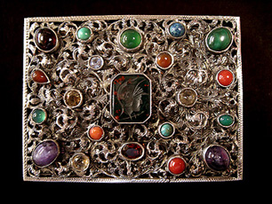 Intricate 800 silver compact, probably Italian, with open scroll work and bloodstone intaglio in the center. The stones include garnets, amethyst, coral, blue topaz, chrysoprase, citrine, carnelian and malachite.