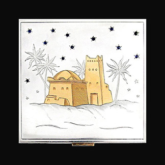 Unusual silver and vermeil compact with sapphire stars depicting a mosque or marabout with French marks, a boars head for 800 silver and a makers mark possibly for Robert Eugene Simon, a Parisian silversmith