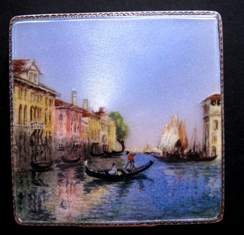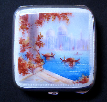 Heavy silver compact marked for London 1913 with painted scene of Venice over a guilloche background.