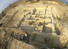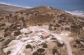 The top of Kourion cliff with the sea below. The red roof covers a small museum that we built over the house being excavated in the previous picture
