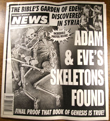 This picture was so popular and touching that it has been stolen at least twice by tabloids. The first time, the Sun used it with the headlines “Adam and Eve discovered in Colorado”! and again a few years later by the Weekly World News as “The Bible’s Garden of Eden Discovered in Syria –Adam & Eve’s Skeletons Found”. You may have seen those at the supermarket – evidently they failed to noticed the tiny infant skeleton barely visible in the mother’s arms – was it Cain or Able?!