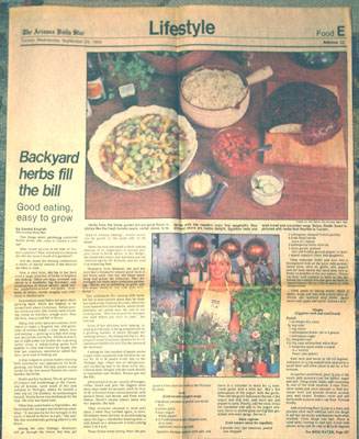 Once in Tucson, rather than look for an office job, I decided to try some things I had always wanted to do. I attended a cooking school and received their Premiere Diplôme Culinaire. With that I opened a small catering business, The Pampered Palate, specializing in intimate dinners for up to 8 people, and I also became a teacher at that school, specializing in soufflés, quiches, breads and herb cookery. My classes and my herb garden were written up by the local paper.