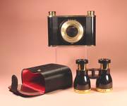 (Left) Whimsical novelty compacts shaped like a camera and pair of binoculars from my collection. (Right) This is the ultra- rare “Bird in Hand” compact by Salvador Dali from my collection