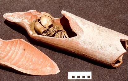 The storage jars were used as caskets for the tiny newborn and prenatal victims of malaria. The scale is in centimeters.